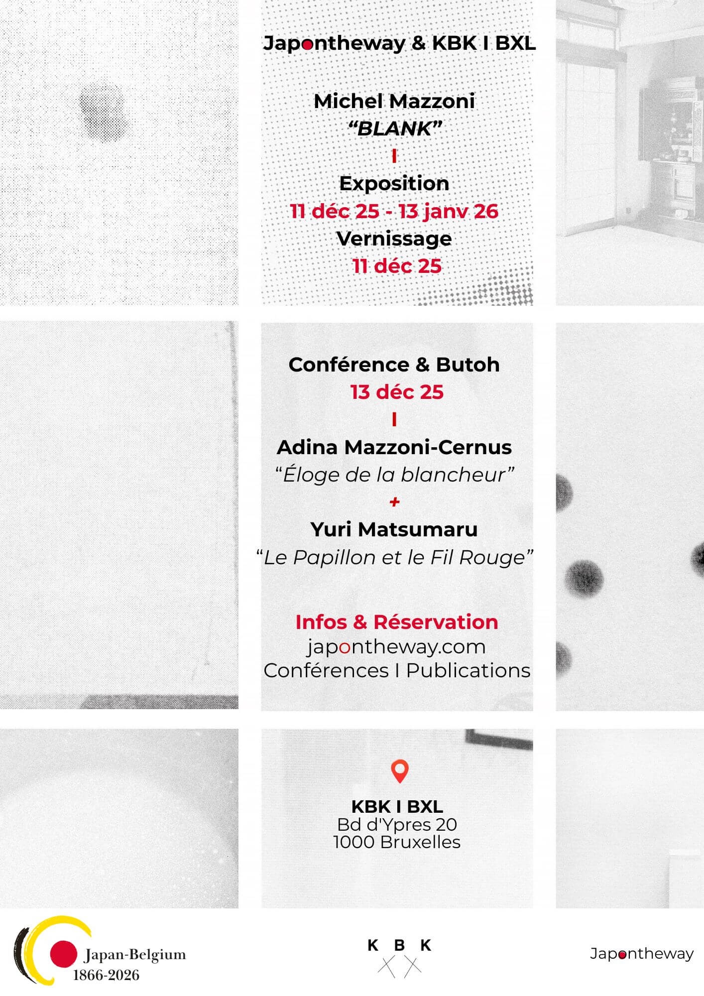 Photo exhibition by Michel Mazzoni : BLANK Lecture by Adina Mazzoni-Cernus : Praise for whiteness Performance butō by Yuri Matsumaru : The Butterfly and the Red Thread Photo exhibition Opening show 11 December 2025 from 6 pm - 9 pm 11 December 2025 - 13 January 2026 (visit by appointment) The exhibition « BLANK » by visual artist Michel Mazzoni, featuring works partly created in Japan, invites reflection on light and space. °°° Lecture (in french) & Butō Saturday 13 December 2025 The lecture In « Praise of Whiteness », given by Adina Mazzoni-Cernus, explores the role of white in Japanese aesthetics and spirituality — a color embodying the sacred, the ephemeral and purity. Finally, the Butoh performance « The Butterfly and the Red Thread », performed by Yuri Matsumaru, evokes transformation, memory, and eternal love through the Japanese legend of the red thread and the symbolism of the white butterfly. Venue : KBK I BXL Boulevard d'Ypres, 20 1000 Brussels Doors open: 5.30 pm Lecture: 6 pm–7 pm Intermission: 7 pm–7.30 pm Butoh: 7.30 pm–8.30 pm Price:20 € by person (cash or Payconiq) Supported by the Embassy of Japan in Belgium. |