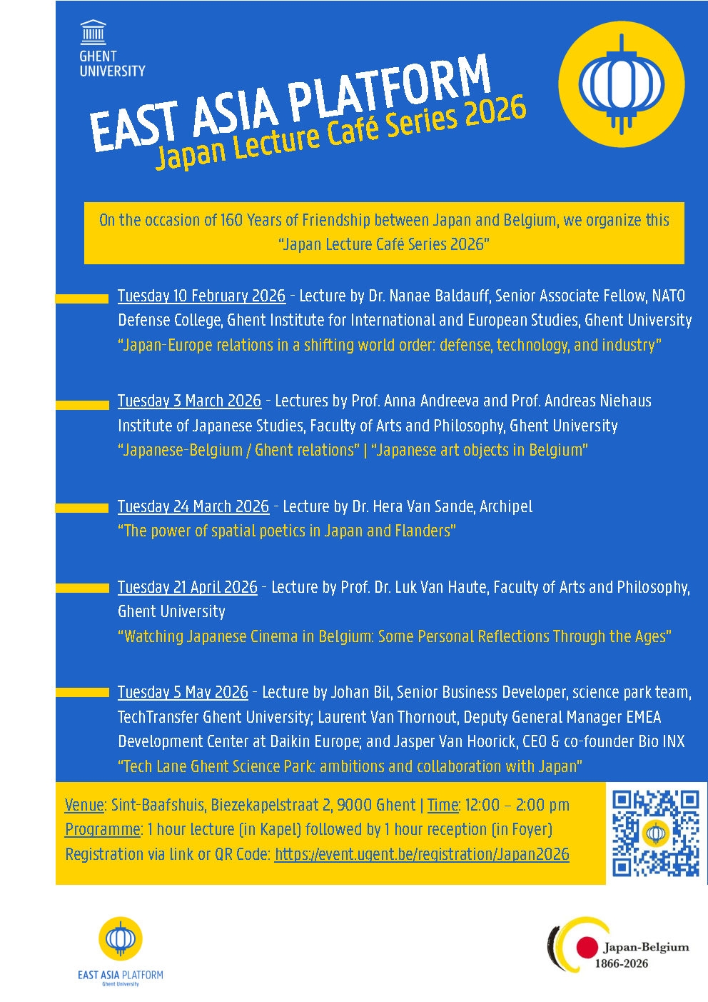Japan Lecture Café Series 2026 on the occasion of 160 Years of Friendship between Belgium and Japan In 2026, Japan and Belgium will celebrate 160 Years of Friendship. Moreover, the city of Ghent will commemorate 55 years of partnership with its twin city Kanazawa. Consequently, the East Asia Platform will contribute to the festivities by organizing this year’s Lecture Café Series focusing on Japan. This lecture series is organized in collaboration with Ghent University’s Institute for Japanese Studies, Department of Languages and Cultures, Faculty of Arts and Philosophy.