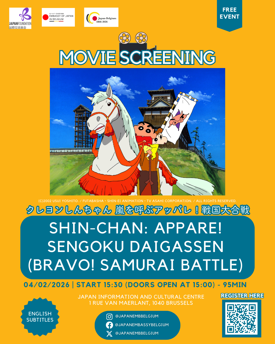 Movie Screening - Shin-chan: Appare! Sengoku Daigassen (Bravo! Samurai Battle) Subtitles in English This award-winning animated film is based on the beloved cartoon series Crayon Shin-chan. Follow the mischievous 5-year-old Shin-chan as he time-travels back to Japan’s Sengoku era (15th–16th century)! One morning Shinnosuke and his parents have the exact same dream. While Shin Chan becomes entranced with the “pretty lady” from that dream, his dog Shiro, also seems to have had the same dream and begins digging a hole in the yard. Shin Chan discovers a wooden box in the hole. There’s a letter inside written in his own handwriting that says he’s in the second year of the Tensho era (1574). Even though he has no recollection of the letter, while standing at the bottom of the hole, he unwittingly travels through time to an unfamiliar place. |