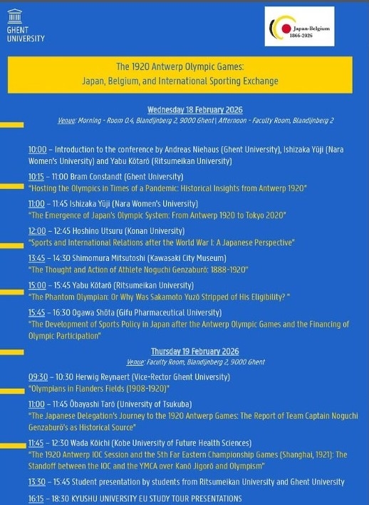 ''The international workshop will shed light on the Japan-Belgium relations during the Antwerp Olympics and will also discuss the relevance for the Antwerp Olympics for the development of sports and athleticism in Japan. As also Japanese students from Ritsumeikan and Kyushu University actively participate, we will be able to connect Japanese and Belgian students in a meaningful and interactive way.''
