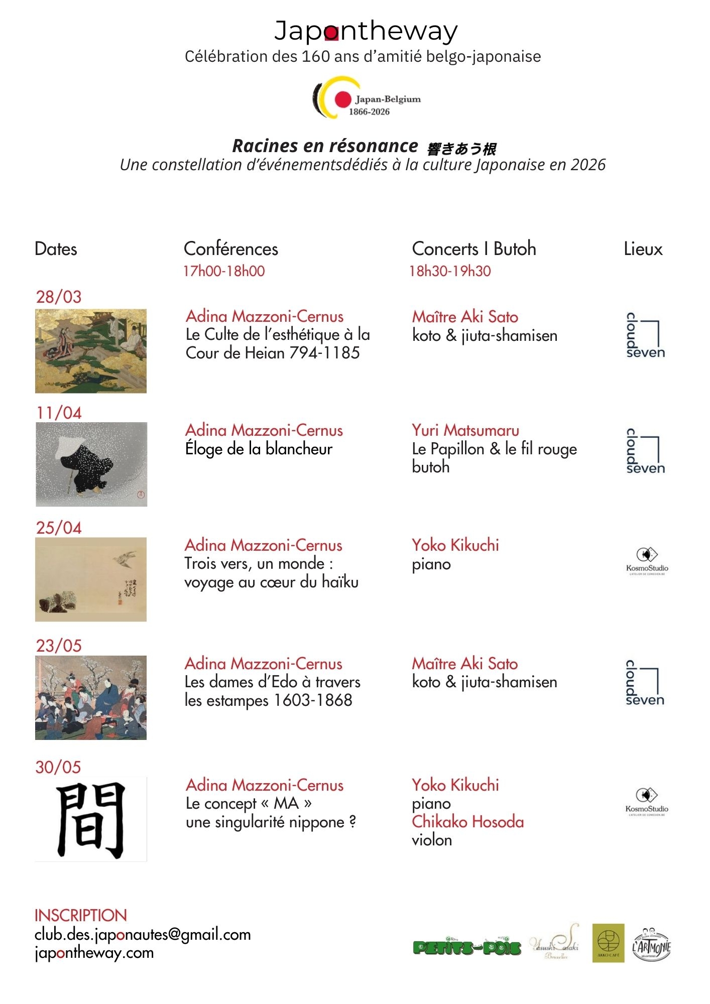 Led by Japanese artists based in Belgium and a lecturer passionate about Japanese culture, Roots in Resonance brings together lectures, concerts, dance, and visual expression. Through traditional, contemporary, and classical music, Butō dance, painting, photography, and oral transmission, the project builds a bridge between Japan and Belgium, inviting audiences to experience cultural dialogue through sound, movement, and storytelling. Program 23 May 2026 | 5:00 - 7:30 PM | Cloud Seven Lecture : Adina Mazzoni-Cernus: “Women of Edo (1603–1868) through ukiyo-e” Concert : Aki Sato: koto & jiuta-shamisen Event Endorsement for the 160 Years of Friendship between Japan and Belgium in 2026 |