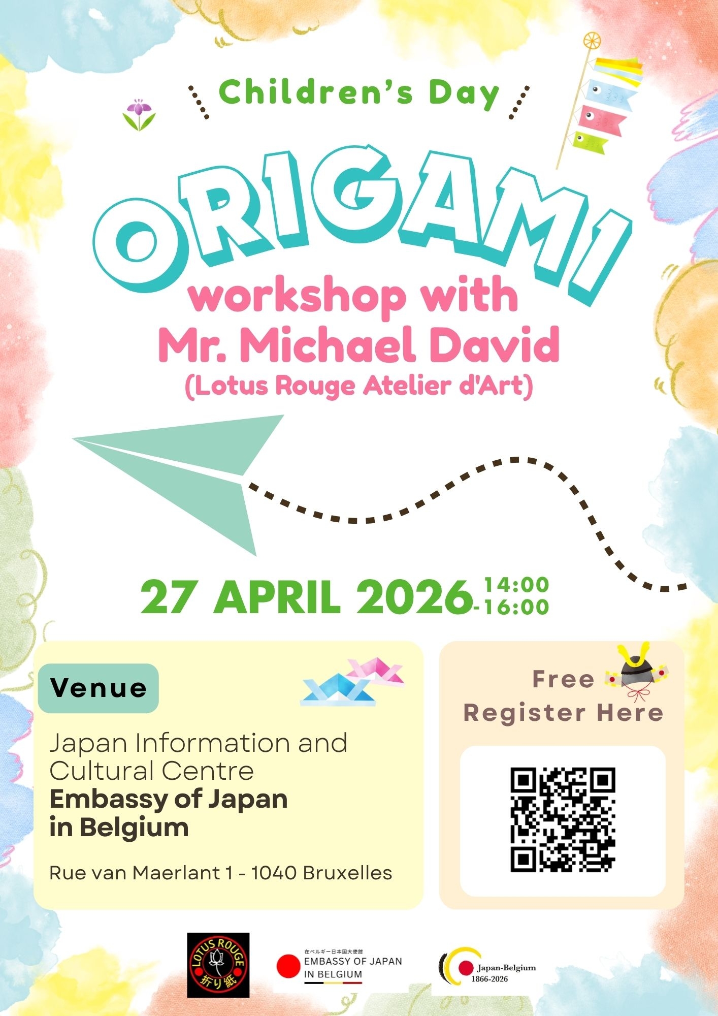 with Mr. Michael David (Lotus Rouge Atelier d'Art) On the occasion of Children's Day (5 May), we will welcome Belgium’s only professional origami instructor, Michael David from Lotus Rouge Atelier d'Art, a special origami workshop at the Embassy! Limited Seats: Only 30 spots available! Children are welcome (recommended age: 6+) * Free - Registration Required |