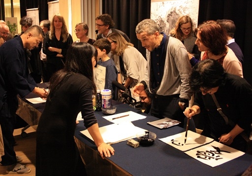 オープニングを記念して,佐藤亜貴氏による箏と三味線の演奏とのコラボレーションにて,「復活」と「花」をテーマとした2作品の揮毫が披露され,満場の参加者から大きな喝采を得ました。また,好きな言葉を表す漢字を墨と筆で書いてみるワークショップも行われ,参加者は初めての書道体験を楽しんでいました。