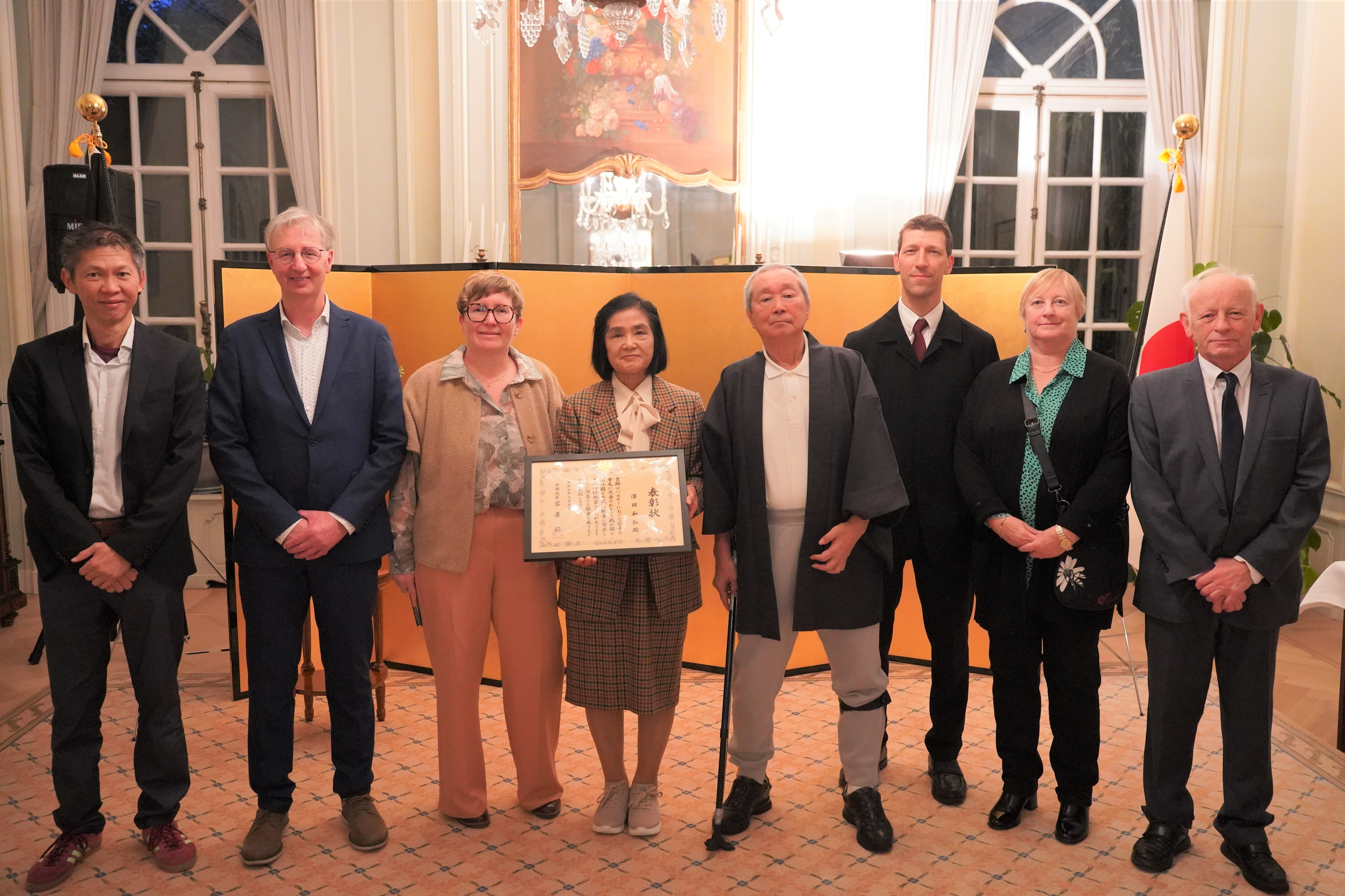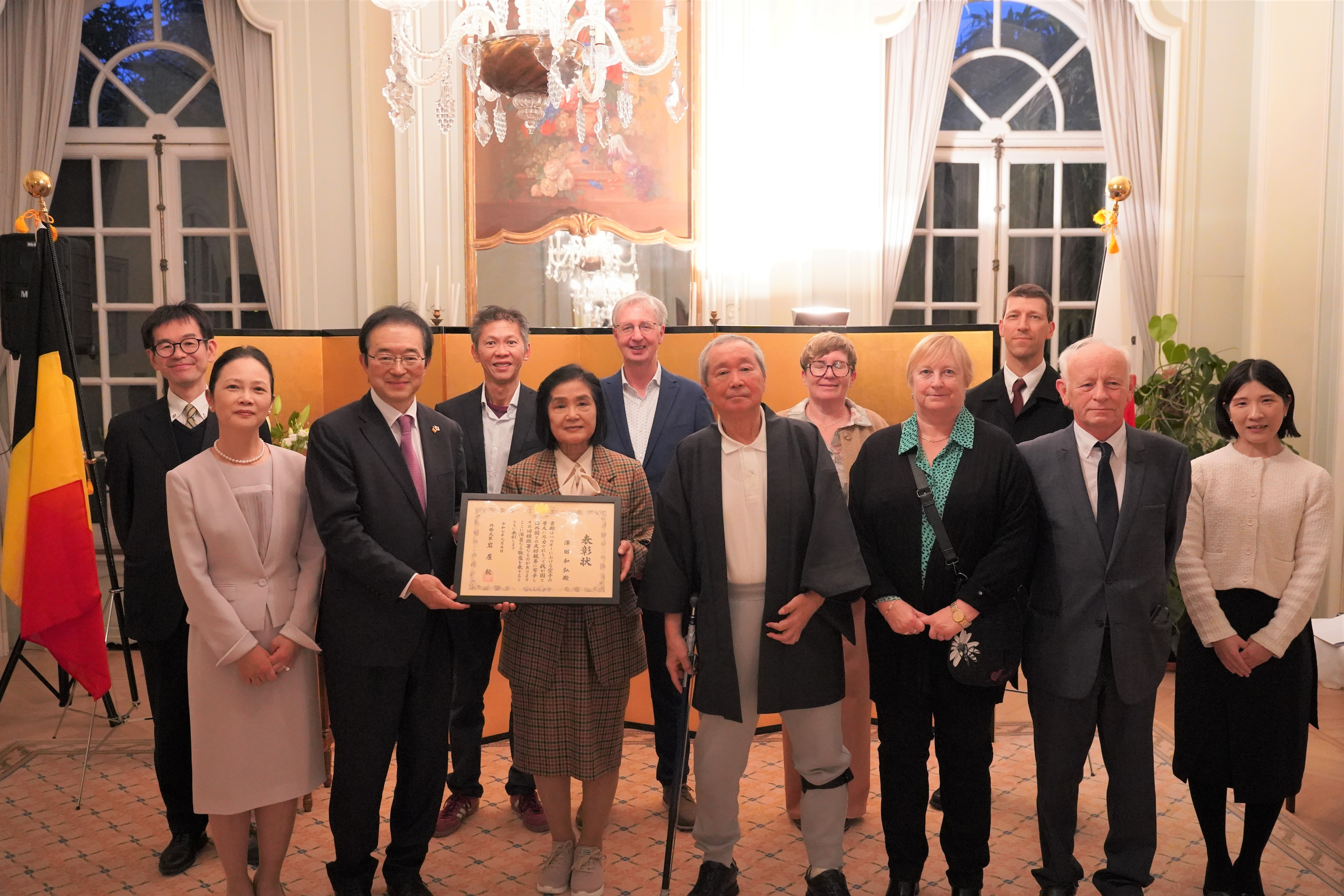 澤田氏は1975年にベルギーに渡航し、同国の空手選手団を指導したことを契機として、以降約40年にわたりベルギーのみならず欧州、アフリカ各国においても、流派を超えた空手指導と審判の育成、段審査等に従事し、ベルギーにおける空手の普及に貢献してきました。 式典では、三上大使より澤田氏の長年の貢献に深い感謝と敬意を表しました。