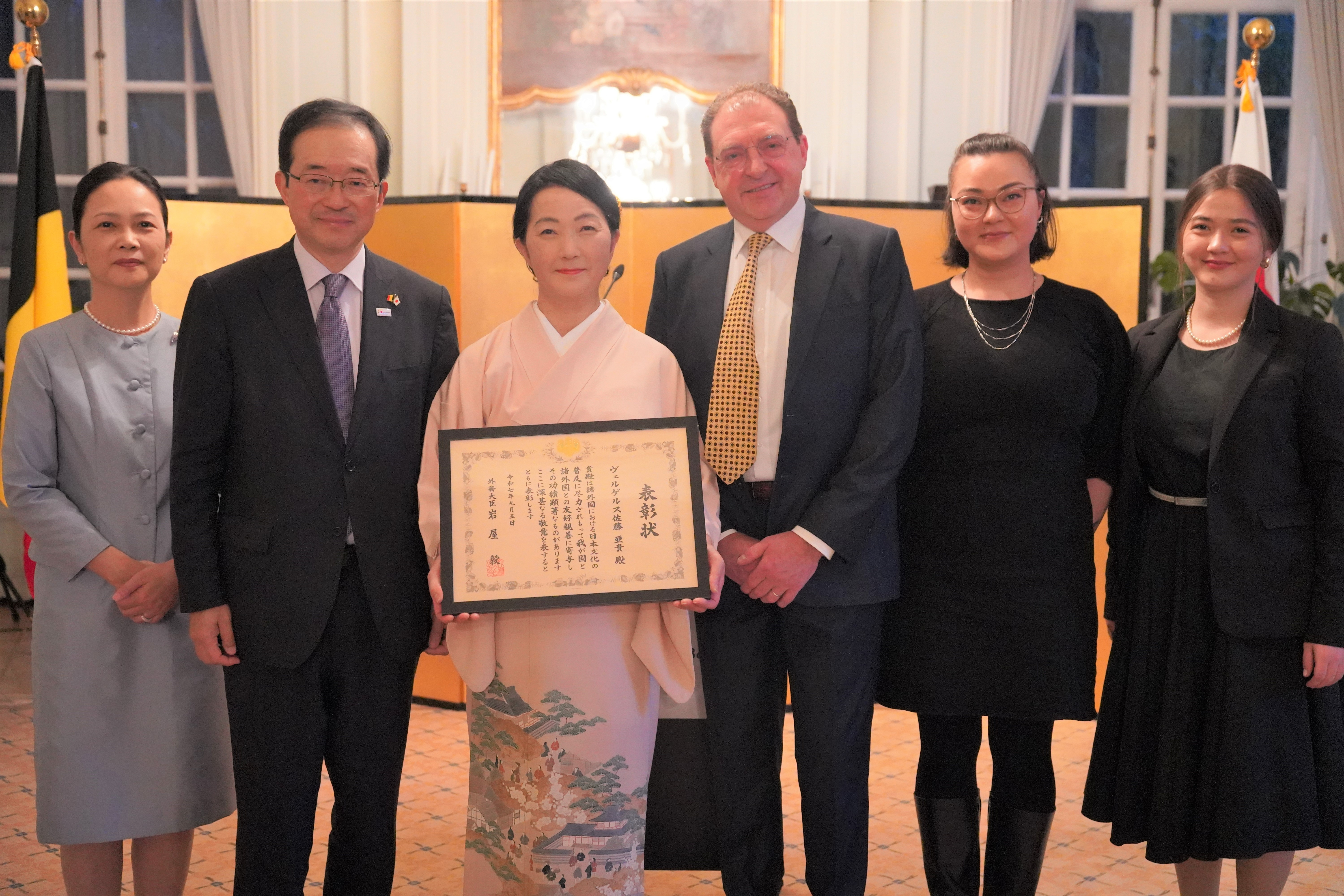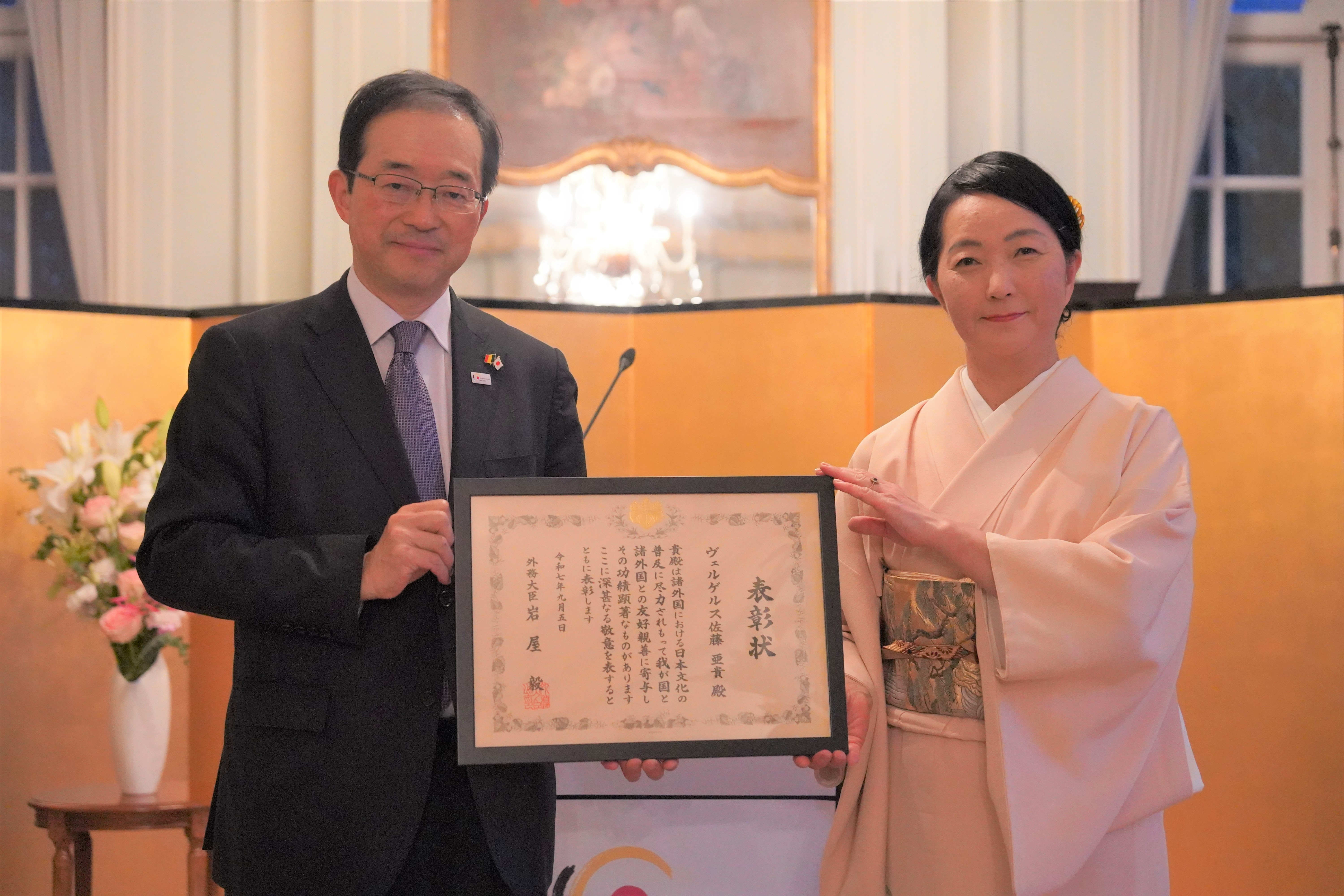 【大使】ヴェルゲルス佐藤亜貴氏(箏・三味線奏者)及び齊藤亜紀氏(バレエダンサー、元アントワープ王立バレエ学校講師)への外務大臣表彰伝達式