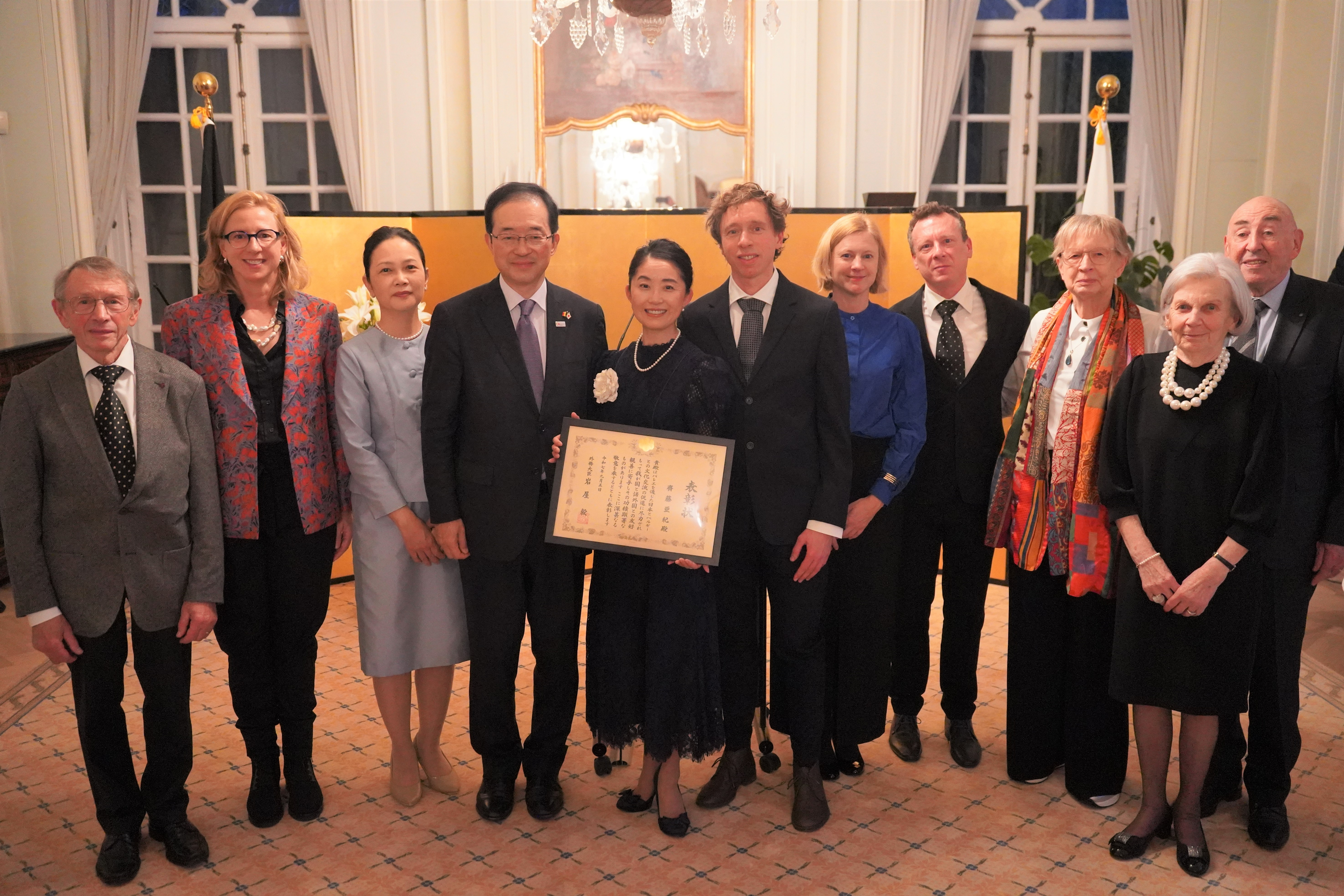10月22日、三上大使公邸において、令和7年度外務大臣表彰を受賞された箏・三味線奏者のヴェルゲルス佐藤亜貴氏、及び齊藤亜紀氏(バレエダンサー、元アントワープ王立バレエ学校講師)への外務大臣表彰伝達式を実施しました。